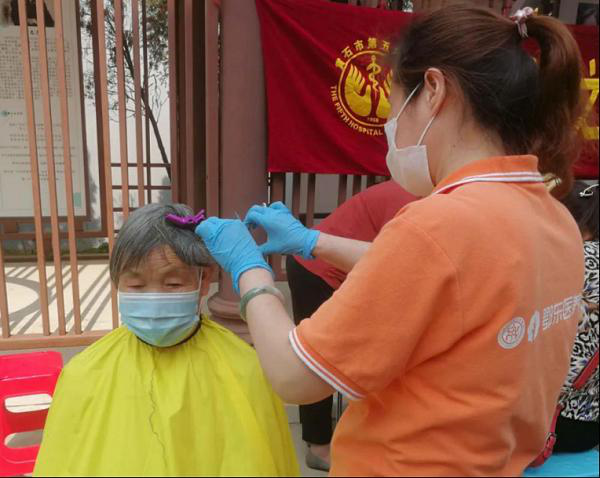 康养中心工作人员为老人理发