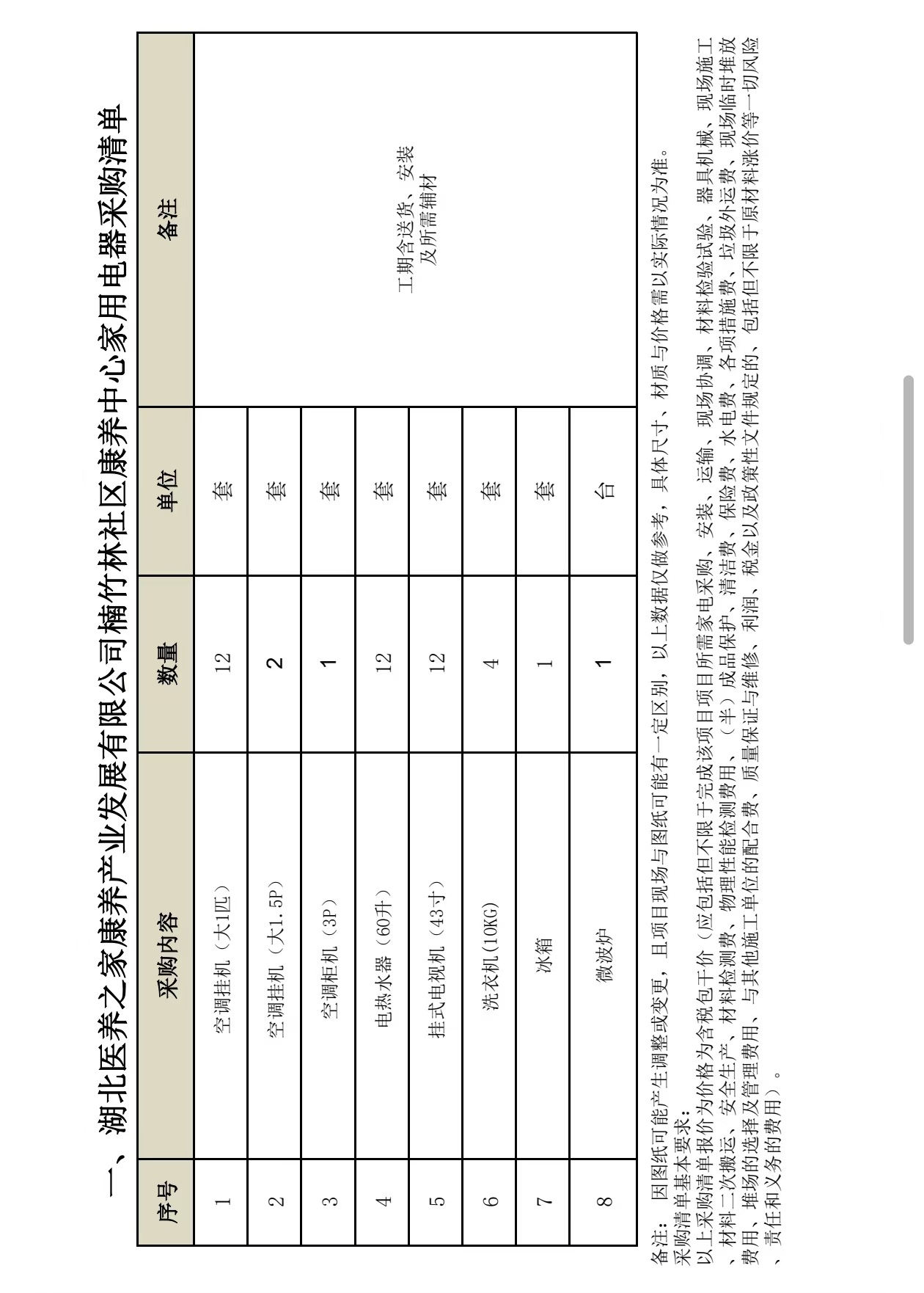 因湖北医养之家康养产业发展有限公司(简称:康养公司)发展需要,拟对楠竹林社区康养中心家用电器项目进行采购,现欢迎符合条件的供应商根据文件要求参加本次活动,项目要求如下: